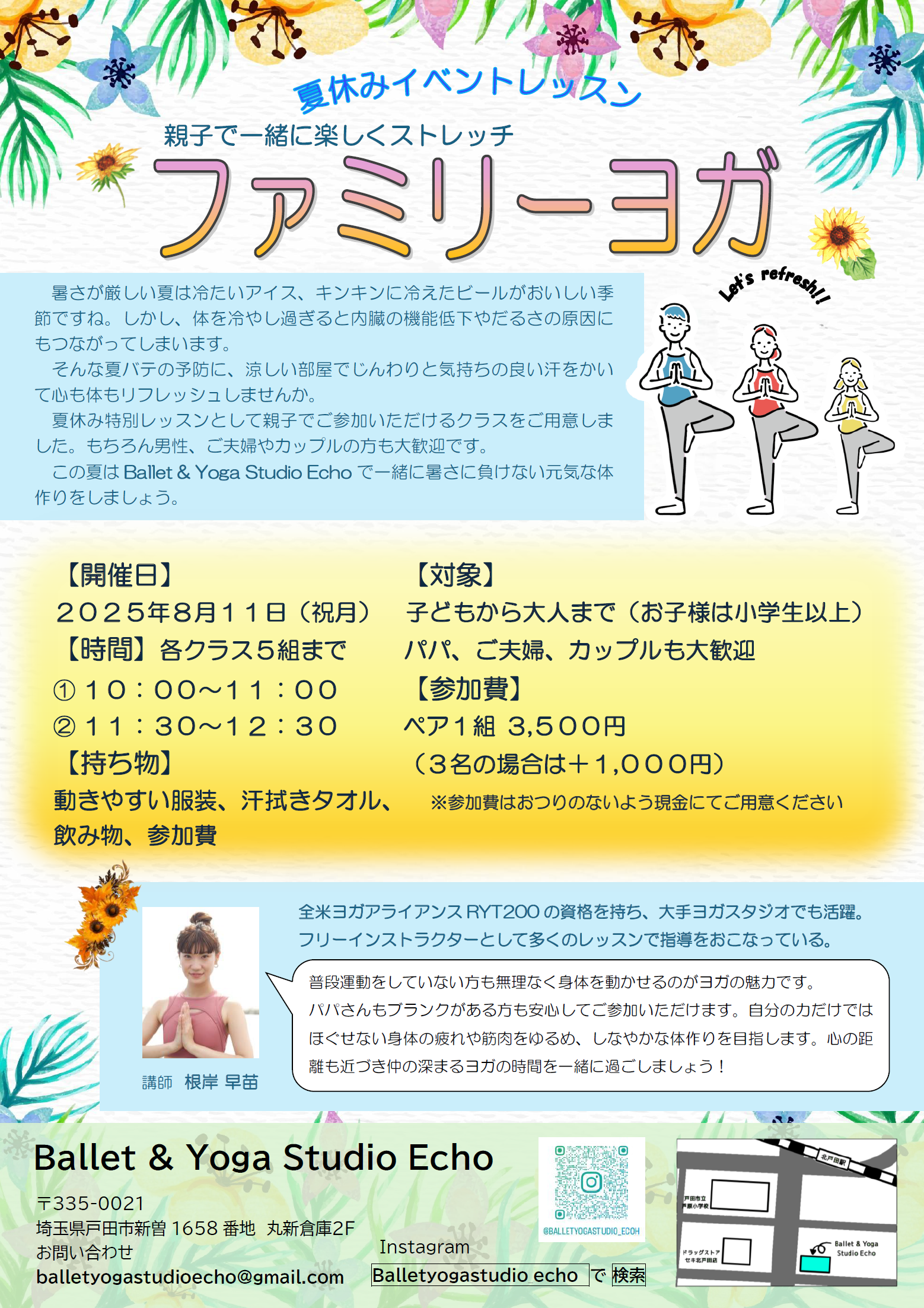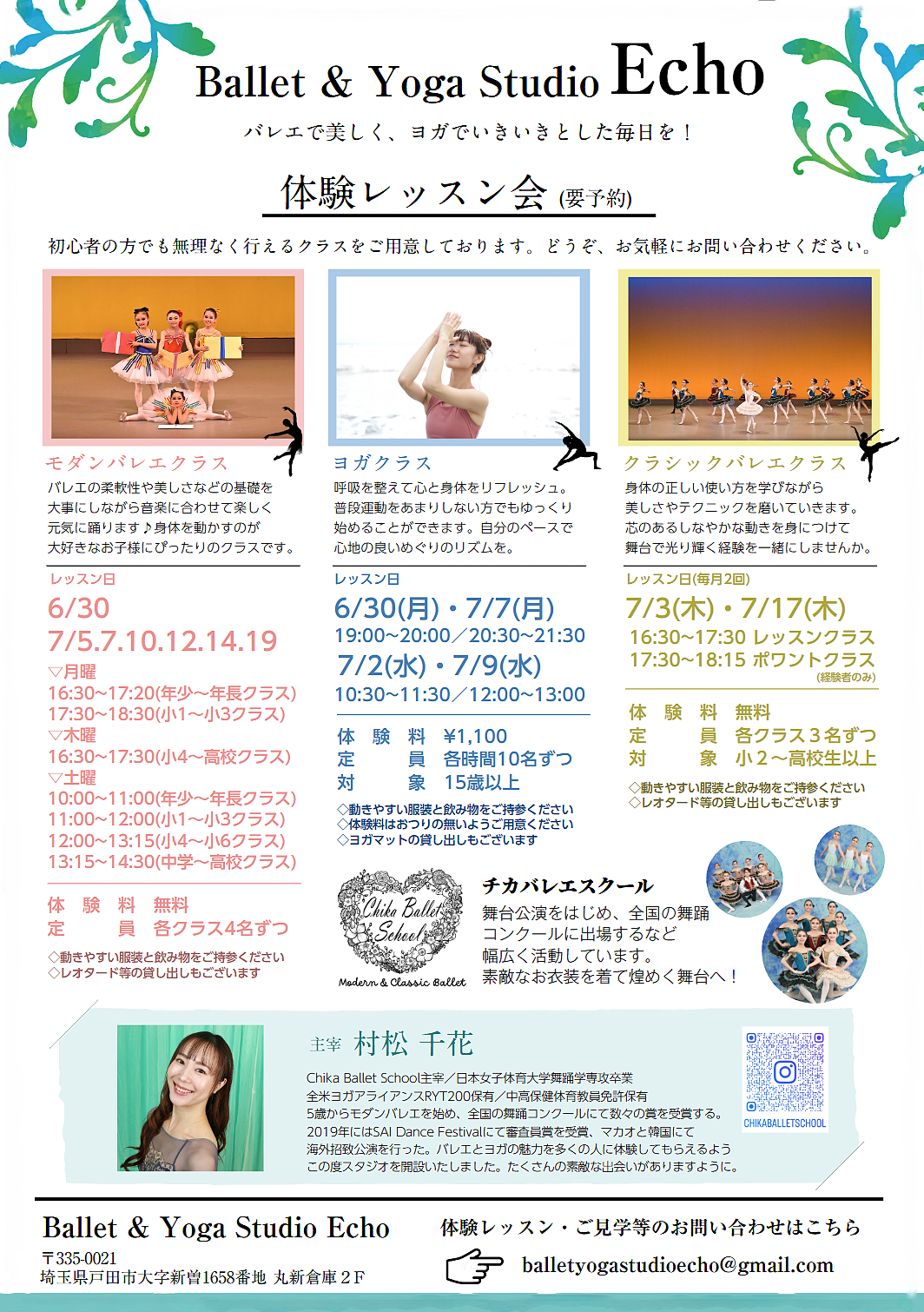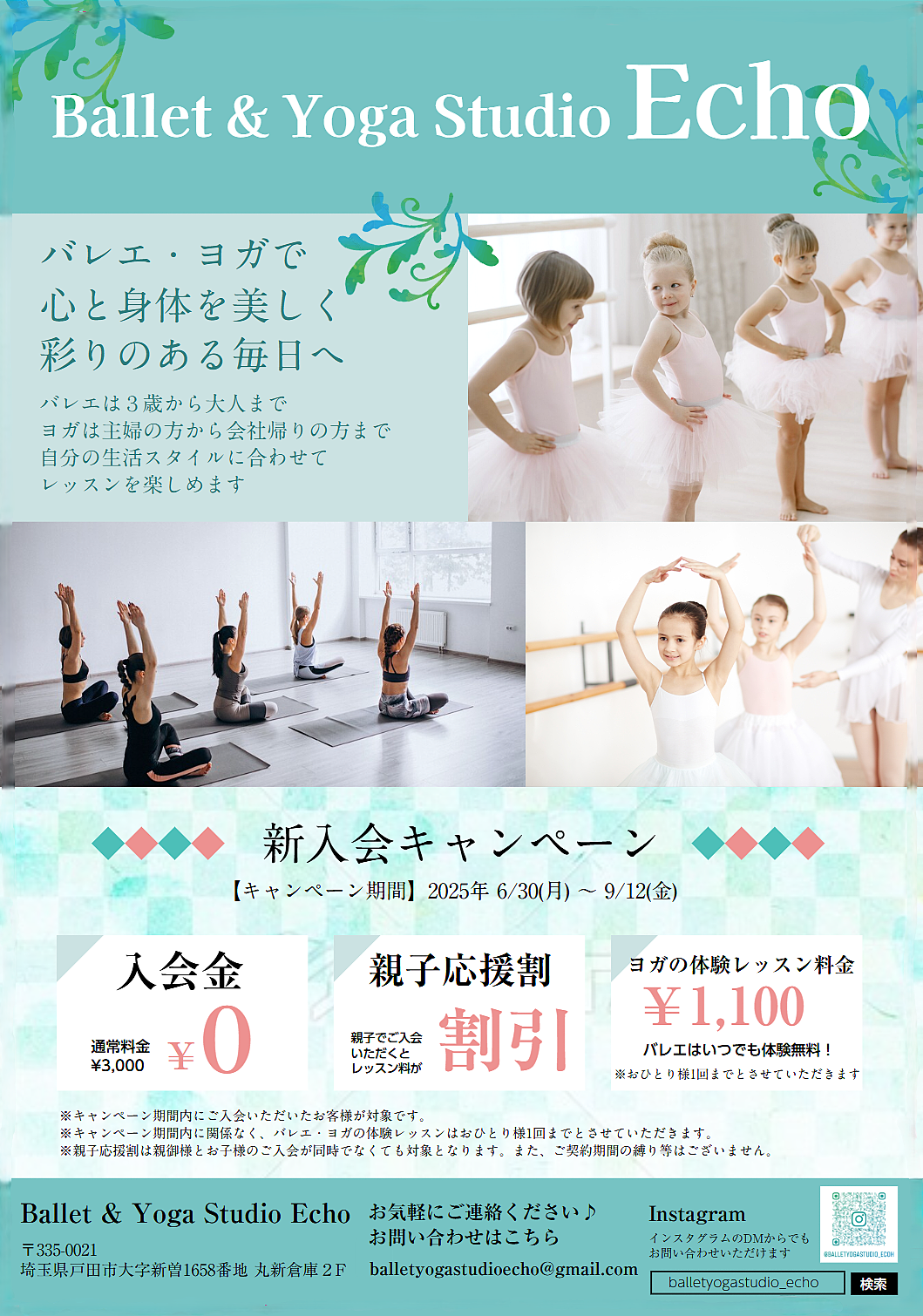 【場所】Ballet & Yoga Studio Echo(北戸田駅西口から徒歩8分)埼玉県戸田市新曽1658番地2階
